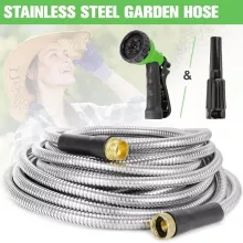 This metal garden hose is equipped with premium materials and a smart design to make outdoor watering, washing, and cleaning tasks simple and efficient. The stainless steel outer layer protects the inner rubber tubing, making it resistant to punctures, kinks, and even pet chewing. The 10-function and 6-function nozzles offer a wide range of watering options, from a gentle spray for plants to a powerful jet for washing cars and boats.