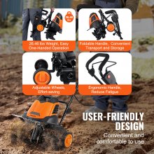 Weighing just 26.46 lbs, this electric rototiller is lightweight and can be carried with one hand. The foldable handle makes it easy to transport and store, while the ergonomic grip and simple switch operation reduce fatigue, letting you work longer with less strain. It’s designed with your comfort and convenience in mind, so you can focus on creating the perfect garden space.