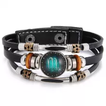 12 Constellation Zodiac Leather & Stainless Steel Cuff Bracelet for Women