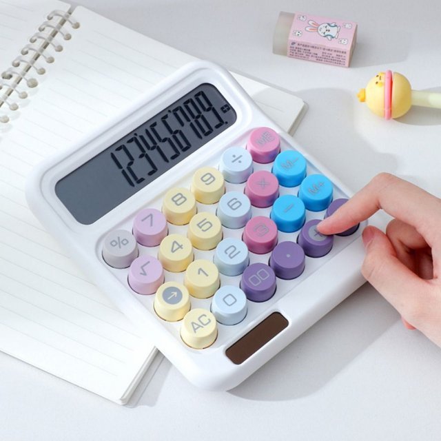 Bring a splash of color and convenience to your workspace with this 12-digit mechanical calculator. Designed for both style and function, it features a large, easy-to-read LCD display and oversized round buttons that make calculations quick and comfortable. Whether you’re balancing budgets, doing homework, or managing office tasks, this calculator adds charm and clarity to every number you crunch.