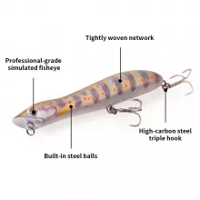 This topwater popper is packed with the essential features every angler wants. Its smooth action and lifelike design make it ideal for early mornings, late evenings, or any time fish are feeding near the surface. The high-resolution body detailing and realistic 3D eyes mimic natural prey, while the durable ABS construction ensures long-lasting performance through countless casts. With two strong and sharp treble hooks, you’ll enjoy dependable hook-ups even during the most aggressive strikes.