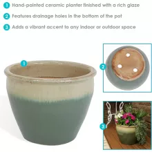 Bring a fresh, natural touch to your home or garden with this stunning 15-inch ceramic planter finished in a soothing seafoam glaze. Designed to combine beauty with lasting strength, this planter is perfect for showcasing your favorite flowers, herbs, or greenery. Its rich, hand-painted finish and kiln-fired ceramic construction ensure a classic shine that will elevate any space.