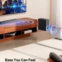This 160W soundbar offers premium audio performance without overwhelming your space. It’s perfect for those who want to enjoy high-quality sound without compromising on aesthetics. The built-in racetrack drivers take up minimal space, while delivering loud, clear sound. The powerful wired subwoofer provides deep bass, so you can feel every beat and rumble. Plus, the 3 custom EQ modes allow you to fine-tune the audio to your preference, making it ideal for movies, music, and games alike.