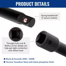 Designed to work seamlessly with your existing socket sets, this high-quality accessory kit includes socket adapters, extension bars, swivel universal joints, and an impact coupler – everything you need to access hard-to-reach spaces and apply torque from different angles. With no high-concerned chemicals used in the manufacturing, this tool set is safe and reliable for long-term use in any workshop or garage.