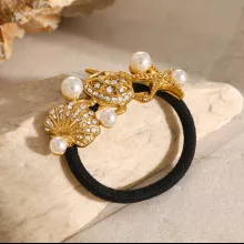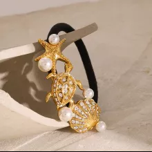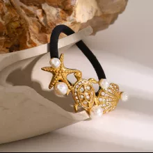 Turn everyday hairstyles into elegant expressions with this stunning 18K Gold Plated Starfish & Turtle Pearl Hair Tie. Crafted with stainless steel and detailed with ocean-inspired shapes like starfish, turtles, and scallops, this glossy black hair rope adds a graceful charm to any look. Adorned with sticky pearls and vintage detailing, it effortlessly blends whimsy and sophistication.