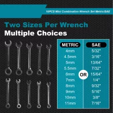Unlock the power of precision with this 20-piece Mini Combination Wrench Set, perfect for tackling projects that demand both quality and versatility. Crafted from durable carbon steel and designed to meet the needs of DIY enthusiasts, this wrench set includes both metric and SAE sizes, giving you the flexibility to handle a variety of tasks. Whether you’re working on machinery, bicycles, or small home repairs, this set is your ultimate companion for efficient and effortless work.