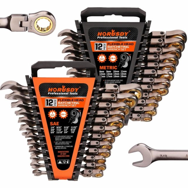 Take on any project with confidence using this 24-Piece Flex-Head Ratcheting Wrench Set. Designed for mechanics, DIY enthusiasts, and anyone who values reliable tools, this set combines durability, versatility, and convenience. With both metric (8mm to 19mm) and SAE (1/4” to 7/8”) sizes included, you’ll always have the right tool at hand. The set comes neatly organized in a storage rack, keeping your workspace tidy and your wrenches easy to grab when you need them.