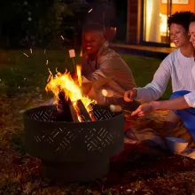 Featuring a modern geometric cut-out pattern, this fire pit beautifully reflects dancing flames to create a cozy atmosphere and charming light effects. The durable steel construction is coated with high-temperature powder for superior rust resistance and long-lasting performance. Its sturdy round base ensures stability even on uneven ground, and the included mesh screen keeps sparks safely contained while maintaining airflow for a strong, consistent fire.