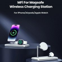 Equipped with official MagSafe technology, this charging station ensures up to 15W fast charging for iPhone 12, 13, 14, and 15 series—matching the original Apple speed. Your Apple Watch and AirPods also get reliable 5W charging each, so everything stays powered up together. With MFi certification, you can trust every charge to be both safe and efficient.