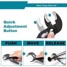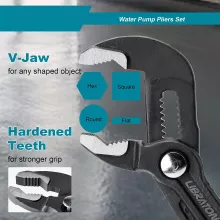 This water pump pliers kit is perfect for plumbing tasks, home repairs, mechanical work, and more. The unique V-Jaw grip outperforms standard pliers by holding onto multiple shapes without slipping. The robust steel build guarantees long service life, while the smart push-button adjustment saves time and boosts efficiency on every task. Whether you’re working in tight spaces or tackling larger fittings, the variety of sizes gives you the right tool at your fingertips.
