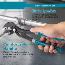 Take control of your toughest plumbing, maintenance, and repair jobs with this premium 3-piece water pump pliers set. Designed for professionals and DIYers alike, these groove joint pliers are crafted from high-strength chrome vanadium steel, ensuring long-lasting durability and reliable performance. Whether you’re tightening pipes, gripping bolts, or handling irregular shapes, this set delivers the grip, flexibility, and control you need to get the job done right.