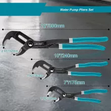 - 3-piece set includes 7-inch, 10-inch, and 12-inch water pump pliers for a range of applications