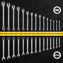 Take on any project with confidence using this complete 30-piece combination wrench set. Covering both SAE sizes from 1/4 inch to 1 inch and metric sizes from 8mm to 22mm, this set ensures you’ll always have the right tool at hand. Each wrench is clearly marked with engraved size indicators, making it quick and easy to identify the piece you need. Whether you’re working at home, in the garage, or on the job, this wrench set is built to deliver reliable performance every time.