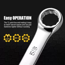 Each wrench is forged from high-strength chrome vanadium steel and finished with polished chrome for a professional look and outstanding durability. Designed to resist corrosion and wear, these wrenches are built to last through years of use. The precision 12-point box end allows for secure fastener engagement, reducing the chance of slippage or rounding off. With a 15-degree offset on both the open and box ends, you’ll have the clearance needed to work in tight or awkward spaces with ease.