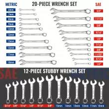 This set includes 20 full-size standard wrenches and 12 compact stubby wrenches, all neatly organized for quick access. The combination of standard and stubby lengths means you can easily work in both open spaces and tight, hard-to-reach areas. Each wrench is designed for durability and grip, making your repair tasks faster and easier.