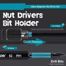 • Strong Magnetic Hold: Each magnetic nut driver and the quick-release bit holder feature a powerful magnet to securely hold nuts and bolts, preventing drops and making fastening effortless. (Note: Deep nut drivers are non-magnetic.)