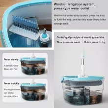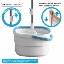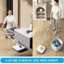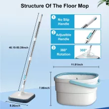 Our spin mop set stands out with its thoughtful, practical features. The dual-compartment bucket keeps clean and dirty water separate, ensuring that only fresh water touches your floors. The 360-degree rotating square mop head easily glides around furniture, under cabinets, and along edges. A built-in brush inside the bucket scrubs the mop head with every spin, giving you a cleaner mop each time — no more messy hands or drips on the floor. The stainless steel handle is adjustable for comfortable use, and the microfiber mop pads are soft yet tough on dirt, making them ideal for both wet and dry cleaning.