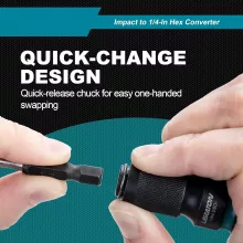 Each adapter in this 3-piece set is crafted from heavy-duty chrome molybdenum (Cr-Mo) steel, known for its exceptional durability and impact resistance. The phosphate finish adds an extra layer of protection, so these converters can handle rough use without flinching. Engineered with a quick-release chuck, the 1/4″ hex bit holders let you switch bits with one hand—saving you time and frustration on the job.