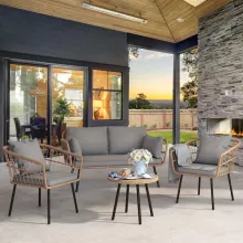 This 4-piece patio furniture set is the real deal it comes to blending style, comfort and durability. It's got a sleek modern minimalist design that just screams elegance and class in my outdoor space. Plus, the all-weather rattan material they used for these pieces? Yeah, that stuff's built to last through every season. But here's where things really start getting good: the cushions. They're thick and comfy as heck - perfect for those lazy afternoons where all you want to do is lounge around with a cold in your hand. And if you're into throwing backyard parties like me? Well then buddy, these are going to be a total game changer! The way I see it, there’s no better feeling than sinking down into one of these bad boys after firing up the grill or setting up some yard games for everyone. You can kick back and relax while waiting for your guests – trust me; they’ll be green with envy once they get a load of your new setup. And let’s not forget how much love went into making sure those cushions were as comfortable as possible – because what good is stylish patio furniture if it doesn’t feel like sitting on clouds? So whether you’re planning on chilling solo or hosting epic gatherings in your backyard - this 4-piece patio set has got everything covered perfectly!