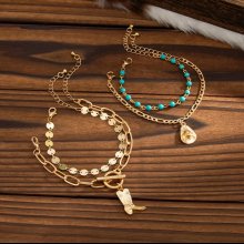 Bring a touch of elegance and individuality to your accessory collection with this stunning 4-piece set of vintage-inspired gold bracelets. Designed with a unique mix of Bohemian flair and hip hop edge, these bracelets are perfect for adding a standout element to any outfit. The beautiful chain and link style, paired with delicate boots pendants, creates a versatile accessory set that blends casual chic with festive charm.