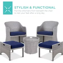 Revamp your outdoor area with this stunning 5-Piece Outdoor Patio Furniture Set. Designed for convenience and style, this set includes two chairs, two matching ottomans, and a versatile side table, all crafted with durable wicker and weather-resistant cushions. Whether you have a spacious backyard or a cozy balcony, this set is perfect for any setting, allowing you to create a charming bistro or a relaxing lounge in minutes.