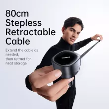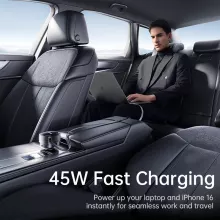 This charger delivers a total output of up to 60W, allowing you to power a laptop, phone, and accessories all at once. It includes one built-in fast-charging Type-C cable, one additional Type-C port, and one USB-A port. The head rotates 180° so you can direct the charger toward the front or back seats for easy access. The retractable cable stretches up to about 31 inches for flexible use, then smoothly winds back in for a clean, tidy setup.