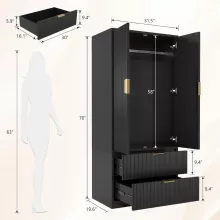 Spacious and smart, this 70″ wardrobe closet (31.5″ W x 70″ H x 19.6″ D) offers generous storage capacity. Inside, you’ll find a sturdy hanging rod perfect for storing dresses, coats, blazers, and trousers. Two deep drawers give you additional room for folded clothes, accessories, or personal essentials. Whether you’re organizing seasonal wear or daily outfits, everything stays accessible and neatly arranged.