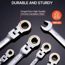 Each wrench is crafted from durable Cr-V steel and heat-treated for long-lasting strength. The 72-tooth ratchet mechanism offers a minimal 5° working swing, while the 180° flex head lets you reach angles standard wrenches can’t handle. Clear size markings ensure you can quickly find the right tool, and the ergonomic design provides a secure, comfortable grip throughout use.