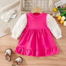 Featuring a classic round neckline and lantern-style long sleeves, this dress offers a blend of casual elegance and playful cuteness. The A-line silhouette and ruched detailing give it a gentle, flowy look that flatters your little one’s shape while keeping her comfortable all day long. Its color-block pattern adds a trendy touch that makes it stand out in any baby wardrobe. Whether it’s for a casual stroll, a family gathering, or a sweet photo shoot, this dress brings style to every moment.