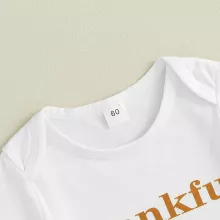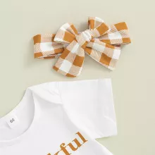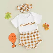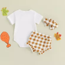 This Infant Girl Thanksgiving Jumpsuit is the perfect outfit for your little one this holiday season! Combining a delightful letter print design with charming ruffled plaid shorts, this romper is not just a statement piece but also incredibly comfortable for your baby. Paired with a sweet bow headband, your baby will be the center of attention at every Thanksgiving gathering.