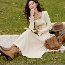 Designed with a square neckline and full-length flare sleeves, this dress brings a touch of French-inspired elegance to your wardrobe. The empire waistline and A-line silhouette enhance your figure, creating a flattering, feminine look that suits a variety of body types. With its mid-calf length, it provides just the right amount of coverage while maintaining a sense of lightness and movement.