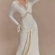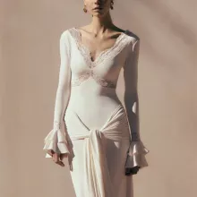 Embrace the cooler seasons with confidence—this dress is versatile enough to wear throughout Autumn, keeping you stylish and warm. The intricate lace patchwork, combined with the long sleeves and deep V-neck, creates an elevated and luxurious look, making this dress perfect for all your upcoming special events.