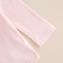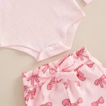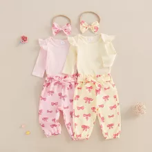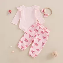 - Complete Set: Includes a long-sleeve ribbed romper, bow-print elastic pants, and an adorable matching headband.