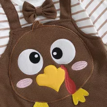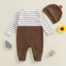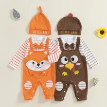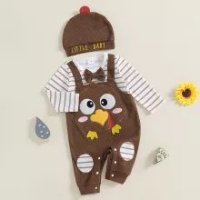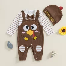 Get your little one ready for the holiday season with this adorable Baby Thanksgiving Romper. Featuring charming turkey embroidery and a playful striped print, this outfit is the perfect choice for a cozy and festive look. The long sleeve design with a crew neck ensures comfort, while the fake two-piece jumpsuit design adds a fun twist. Paired with a cute matching hat, this romper is an absolute must-have for your baby’s first Thanksgiving!