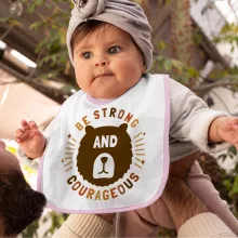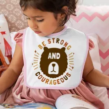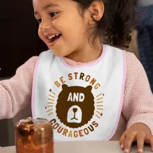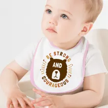 Whether a newborn or an infant, these will fit great. They fit children up to 36 months. A soft & cozy around-the-neck fit will help ensure feeding time is a little more stress-free. Be Strong And Courageous Baby Bibs is 8 x 9 inches, suitable for most babies.