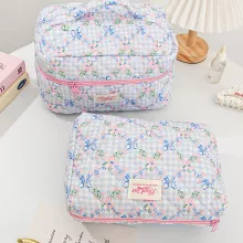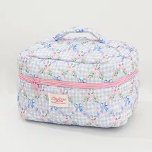 Blue Checkered Flower Bow Quilted Makeup Bag – Travel Zipper Cosmetic Case