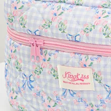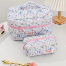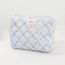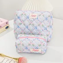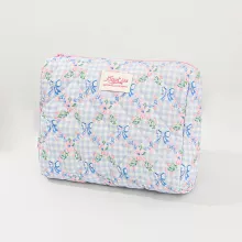 Bring style and organization to your beauty routine with our Blue Checkered Flower Bow Quilted Makeup Bag. This delightful cosmetic case is the perfect blend of cute design and everyday practicality. With its soft quilted texture, blue checkered pattern, and adorable bow detail, this bag isn’t just storage—it’s a statement. Whether you’re jet-setting across the globe or just heading out for the weekend, this zipper makeup bag makes it easy to keep your essentials in one beautiful place.