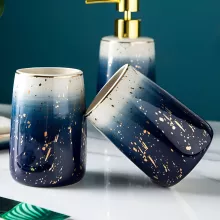This bathroom amenity set stands out for its artistic finish and timeless style. The gold-sprayed accents shimmer softly under bathroom lighting, giving the set a refined, modern look. It’s best used for daily routines such as morning freshening, nighttime cleansing, and guest hospitality. Because it blends function with beauty, it complements nearly any décor—from minimalistic to contemporary or classic.