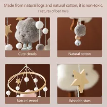This adorable crib mobile features soft, cloud-themed rattles and geometric shapes crafted from smooth, baby-safe wood. With CE-certified materials and gentle textures, it offers both safety and sensory stimulation. The lightweight pieces dangle securely and rotate slowly, capturing your baby’s attention while helping them relax. The convenient Bluetooth box gives parents full control over the audio content, making this mobile useful throughout early childhood.
