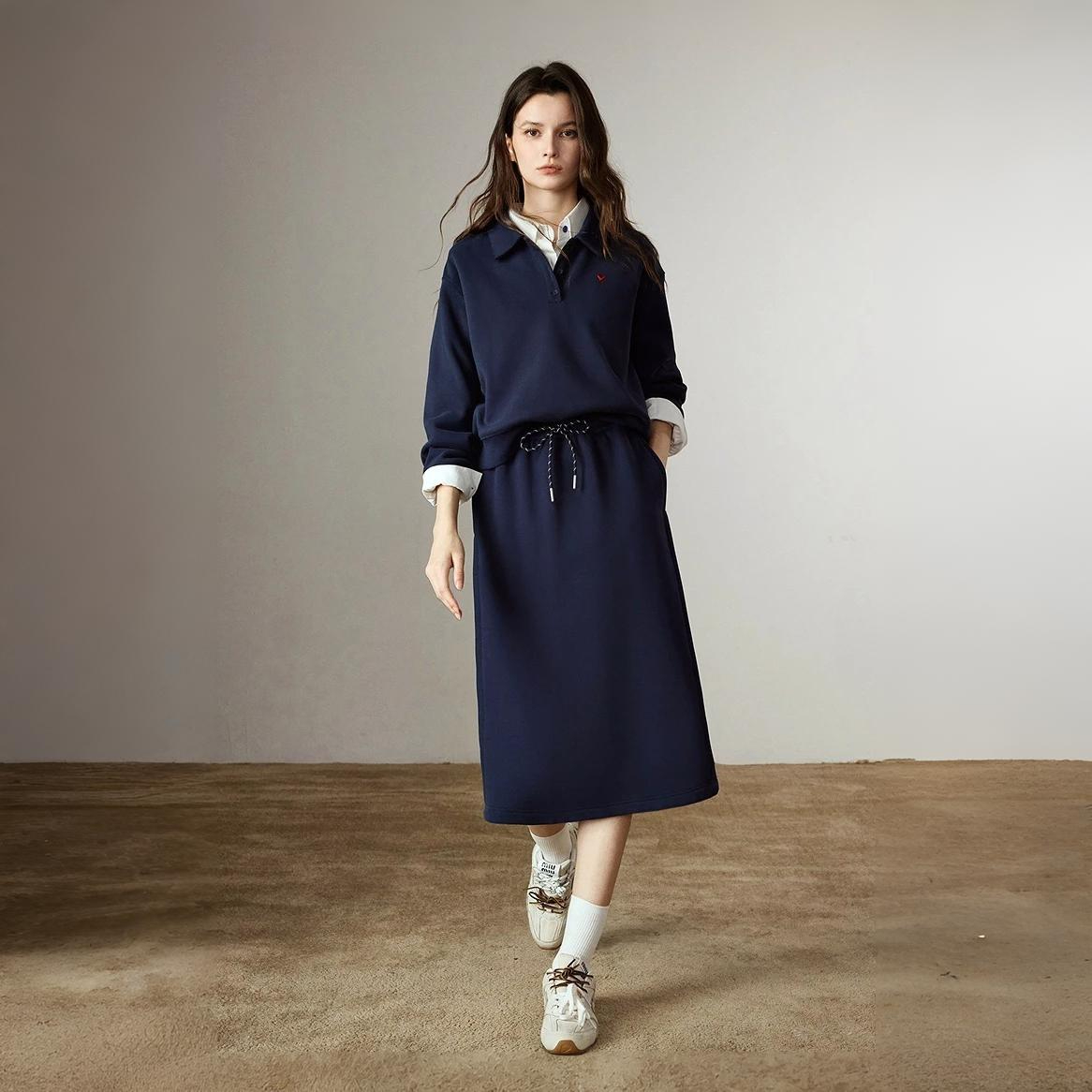 - Silhouette: Straight A-line cut with mid-calf hem
