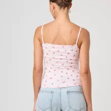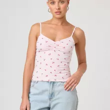 The cherry print brings a youthful, vintage-inspired vibe that pairs perfectly with high-waisted shorts, jeans, or skirts. Whether you’re going for a casual daytime look or dressing it up for a night out, this top offers versatile styling options that suit any mood or setting.