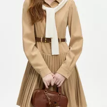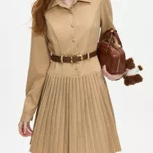 Step into the new season with confidence and elegance with this stunning khaki long sleeve dress. Perfect for any office setting, this knee-length dress is designed to offer a sophisticated look with a touch of flair. Crafted from a soft blend of 98.3% polyester and 1.7% spandex, it offers just the right amount of stretch to keep you comfortable throughout your busy day. The empire waistline beautifully accentuates your silhouette while the pleated skirt adds a flattering movement, making this piece a timeless wardrobe essential for the modern woman.