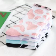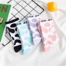 Step into the season with these charming Harajuku-inspired cow print summer socks, designed to bring a splash of fun and freshness to your everyday outfits. Featuring soft pastel tones in pink, blue, and purple, these socks blend adorable cartoon style with the cozy feel you love. Made with a breathable mix of cotton, polyester, spandex, and nylon, they offer a smooth knit finish and a comfortable middle-tube height that’s perfect for daily wear.