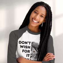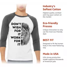 Don’t Wish for It Work for It Baseball T-Shirt is proudly made with 7x less water than average manufacturers, in recycle-friendly facilities that also guarantee zero sweatshop conditions. Lion 3/4 Sleeve is designed and printed in California.