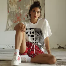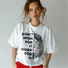 Don’t Wish for It Work for It T-Shirt is no ordinary piece of clothing. Its taped neck and shoulders, double-needle sleeve and bottom hems, and quarter-turned construction provide a retail fit for clothing that’s true to size. Lion Heavy Cotton Tee is Designed and printed in California.