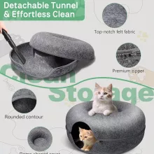 Unlike standard cat beds, this donut design combines a plush resting area with an interactive tunnel, stimulating your cats’ natural hunting instincts and playful behavior. The split feature offers unmatched versatility, adapting to your pets’ needs and making cleaning effortless. Plus, the sturdy felt material maintains shape without collapsing, even during energetic play.