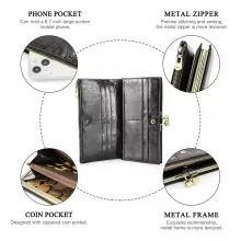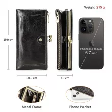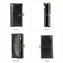 This wallet is thoughtfully designed to meet all your needs. Made from soft yet durable genuine cow leather, it offers a smooth touch and long-lasting wear. The interior is lined with polyester for extra durability and easy cleaning. Multiple compartments inside include dedicated slots for credit cards, a coin pocket with a zipper closure, a spacious note compartment, and even a special pocket for your cell phone. With a length of over 26 inches and a slim profile, it fits comfortably in your hand or handbag.