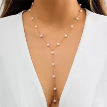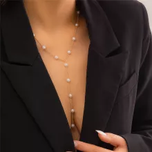 Lightweight and comfortable, this necklace drapes gracefully across your chest, making it ideal for layering or wearing solo for a bold yet refined statement. The classic white pearls are flawlessly round, capturing the look of luxury without the cost. Meanwhile, the rich gold-colored chain adds warmth and contrast, enhancing the overall sophisticated aesthetic.
