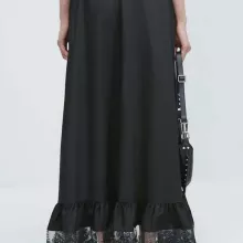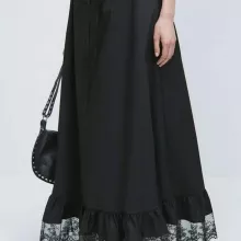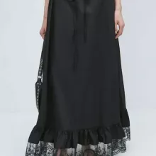 The pleated silhouette paired with a flattering high waist creates a graceful, flowy shape that complements all body types. A stylish lace-up drawstring at the waist adds just the right amount of detail, while the woven cotton fabric ensures durability and ease of movement. The solid black color makes it incredibly easy to style with virtually anything in your wardrobe—pair it with a fitted blouse, crop top, or cozy knit sweater for a look that’s always on-trend.