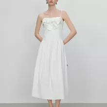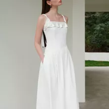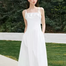 With its sleeveless spaghetti straps and square neckline, the dress frames your shoulders and collarbones beautifully, creating a flattering and feminine look. The A-line cut softly skims the waist and flares gently to a mid-calf length, making it both comfortable and figure-enhancing. Made entirely from premium polyester, it offers a soft, non-stretch fit with a subtle sheen that adds to its quiet charm. A lace-up detail brings a hint of romance, while the pullover style ensures easy wear.